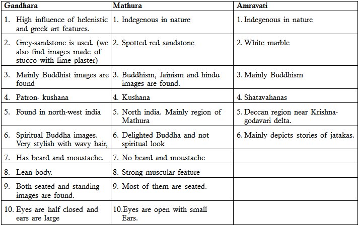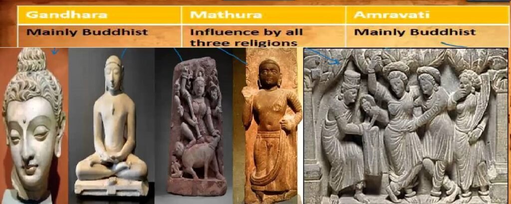 Sculpture: Post Mauryan empire three prominent schools of the sculpture came into prominence in three different regions of India namely Gandhara, Mathura, and Amravati schools.