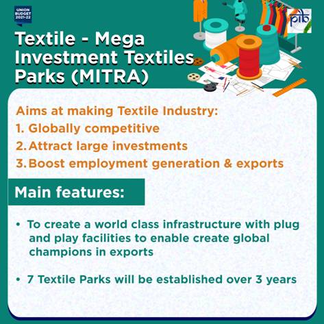 Context: The Government has proposed a scheme of Mega Investment Textiles Parks (MITRA) to enable the textile industry to become globally competitive, attract large investments, boost employment generation and exports.
