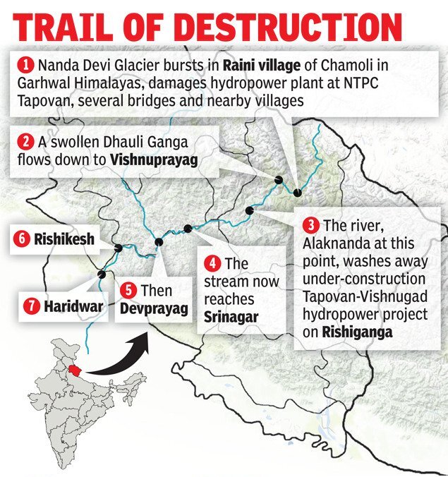 Context: Parts of Uttarakhand on Sunday witnessed massive flooding after a chunk of the Nanda Devi glacier broke off at Joshimath in Uttarakhand’s Chamoli district. Bringing back haunting memories of the 2013 Kedarnath calamity, the glacier break caused large-scale devastation in the upper reaches of the ecologically fragile Himalaya.