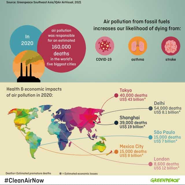 Cost Estimator: The ‘Cost Estimator’, an online tool that estimates the real-time health impact and economic cost from fine particulate matter (PM 2.5) air pollution in major world cities, was deployed in a collaboration between Greenpeace Southeast Asia, IQAir and the Centre for Research on Energy and Clean Air (CREA). Computing the “Lost Years”