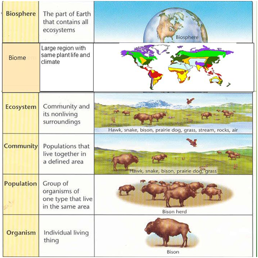Individual, Species, Organism: An individual is any living thing or organism. Individuals do not breed with individuals from other groups. Animals, unlike plants, tend to be very definite with this term because some plants can cross-breed with other fertile plants. In the diagram above, you will notice that Gill, the goldfish, is interacting with its environment, and will only crossbreed with other gold fishes just like her. Population: A group of individuals of a given species that live in a specific geographic area at a given time. (example is Gill and his family and friends and other fishes of Gill’s species) Note that populations include individuals of the same species, but may have different genetic makeup such as hair/eye/skin colour and size between themselves and other populations. Community: This includes all the populations in a specific area at a given time. A community includes populations of organisms of different species. In the diagram above, note how populations of gold fishes, salmons, crabs and herrings coexist in a defined location. A great community usually includes biodiversity. Ecosystem: As explained in the pages earlier, ecosystems include more than a community of living organisms (abiotic) interacting with the environment (abiotic). At this level note how they depend on other abiotic factors such as rocks, water, air and temperature. Biome: A biome, in simple terms, is a set of ecosystems sharing similar characteristics with their abiotic factors adapted to their environments. Biosphere: