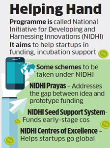 NIDHI focuses on building a seamless and innovation driven entrepreneurial ecosystem especially by channelizing youth towards it and thereby bringing in the positive impact on the socio-economic development of the country. • The program aims to provide technological solutions not only to the pressing needs of the society but also targets to create new avenues for wealth and job creation. • NIDHI, by design connects and strengthens all the links of the innovation chain from scouting to sustaining to securing to scaling to showcasing, because a chain is only as strong as its weakest link. • The key stakeholders of NIDHI includes various departments and ministries of the central government, state governments, academic and R & D institutions, mentors, financial institutions, angel investors, venture capitalists, industry champions and private sectors. • NIDHI strongly addresses the new national aspirations by massively scaling up DST’s experience of three decades in promoting innovative startups. • There are 8 components of NIDHI that support each stage of a budding startup from idea to market. The first component PRAYAS (Promoting and Accelerating Young and Aspiring Innovators & Startups), launched on 2nd September, 2016, aims to support innovators to build prototypes of their ideas by providing a grant up to Rs.10 lakhs and an access to Fabrication Laboratory (Fab Lab). • The final component is the Seed Support System which provides up to One Crore rupees per start-up and is implemented through Technology Business Incubators.