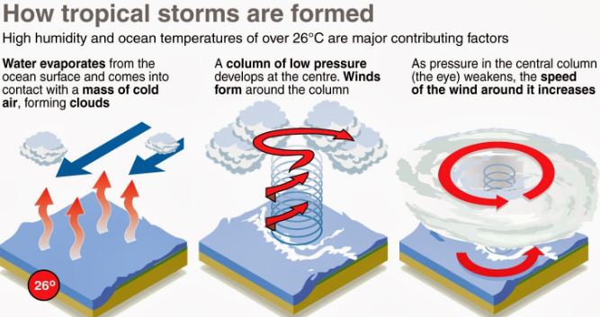 e) They then lose energy and subside — Ocean water at 30 ° latitude is not warm enough to sustain a cyclone. Also increasing wind shear due to westerlies doesn’t facilitate the formation of cyclonic vortex.