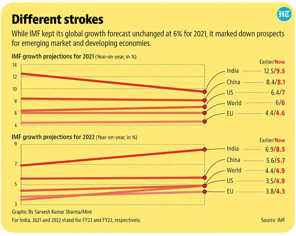 Context: Recently, the International Monetary Fund (IMF) in its World Economic Outlook (WEO) report has slashed India’s economic growth projection for FY22 to 9.5% from 12.5% estimated in April.