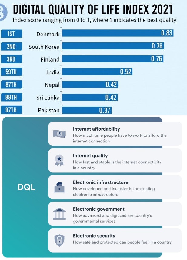Context: According to the latest Digital Quality of Life Index from Surfshark Digital, India ranks 59th among 110 countries.