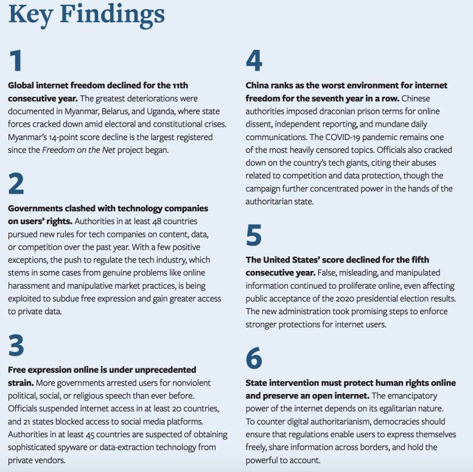 Context: Recently, a report named “Freedom on the Net 2021: The Global Drive to Control Big Tech" was released by the U.S.-based Freedom House. Internet freedom