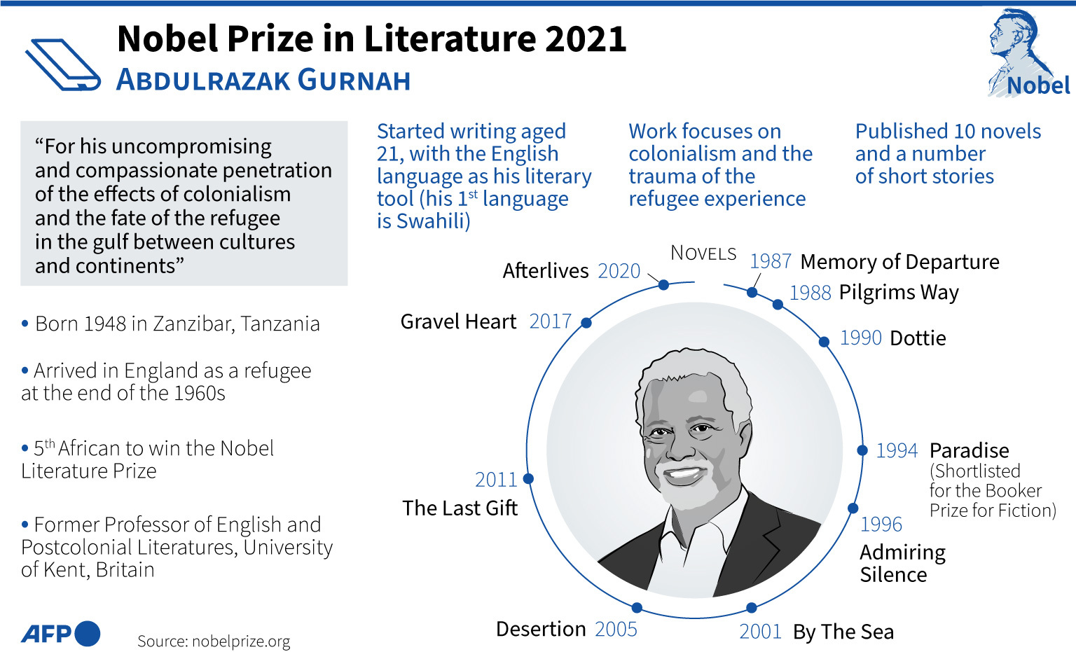 Nobel Literature Prize 2021: Abdulrazak Gurnah Context: 2021 Nobel prize in literature has been awarded to the novelist Abdulrazak Gurnah, for his “uncompromising and compassionate penetration of the effects of colonialism and the fate of the refugee in the gulf between cultures and continents”.