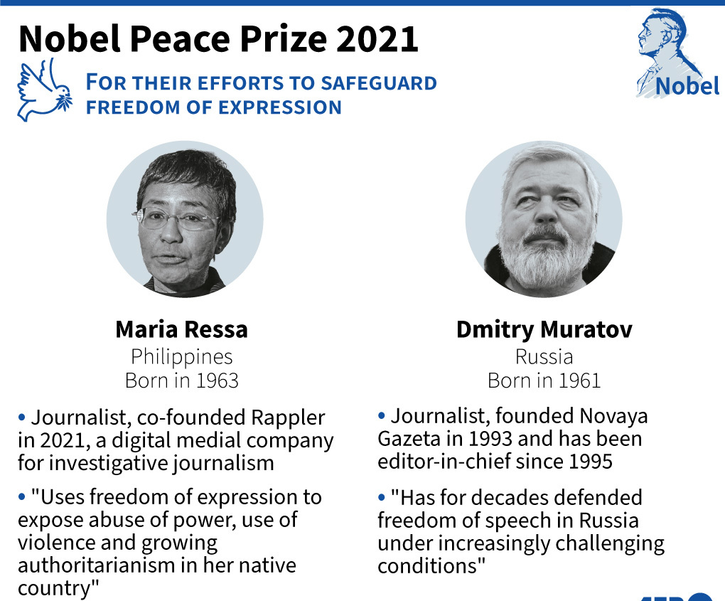 Nobel Peace Prize 2021 Context: Journalists Maria Ressa of the Philippines and Dmitry Muratov of Russia won the 2021 Nobel Peace Prize, for their fight for freedom of expression in countries where reporters have faced persistent attacks, harassment and even murder.