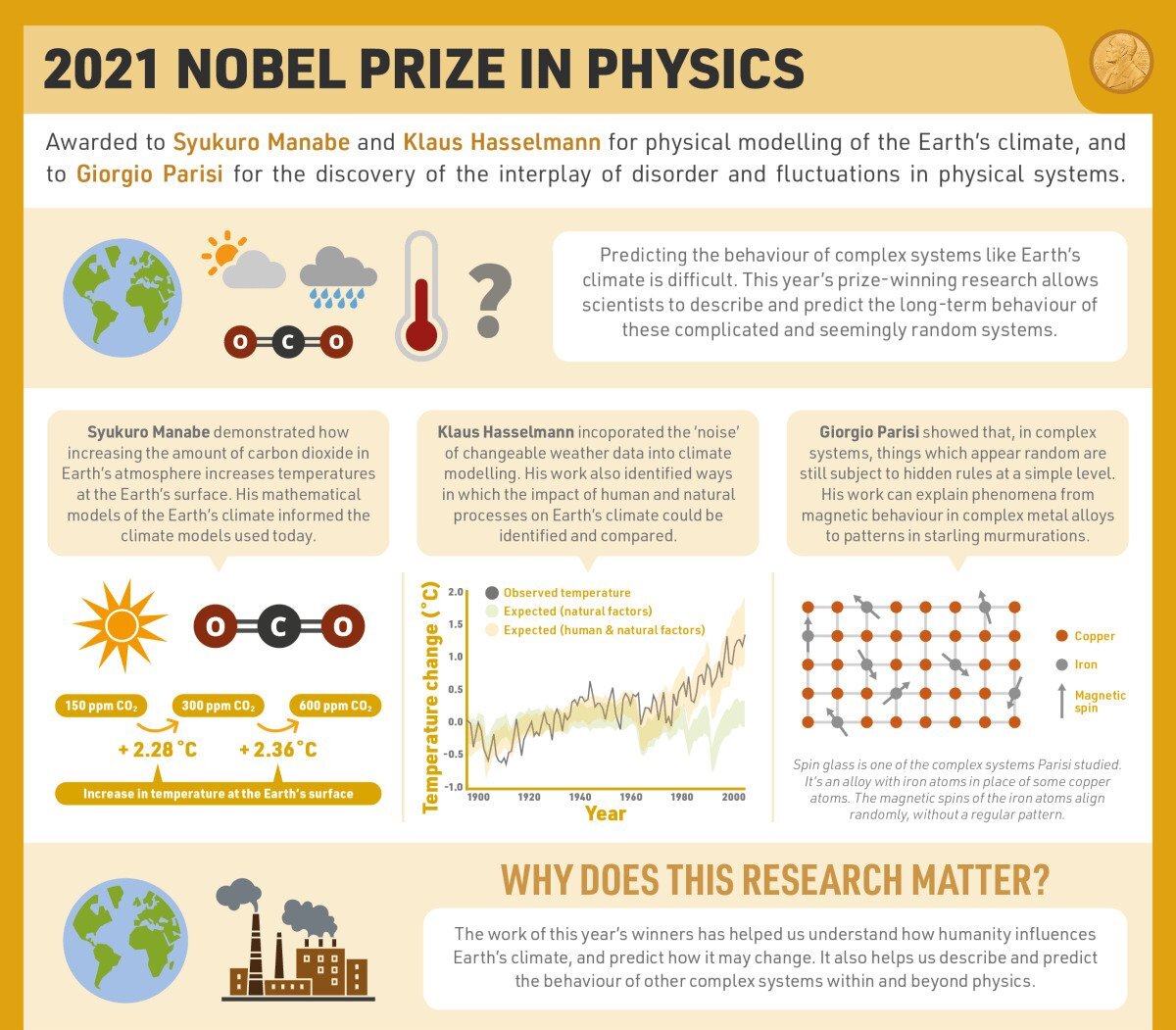Nobel Prize in Physics 2021 Context: Three scientists have won the 2021 Nobel prize in physics for their groundbreaking contributions to our understanding of complex physical systems – including how humanity influences the Earth’s climate. Key Points