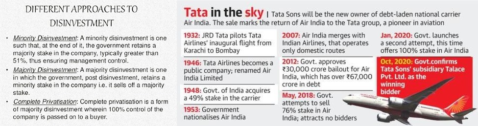 Context: Recently, the government announced its decision to sell all its stake in Air India (AI) as well as AI’s stake in two other businesses — Air India Express Ltd (AIXL) and Air India SATS Airport Services Pvt Ltd (AISATS). Key Points