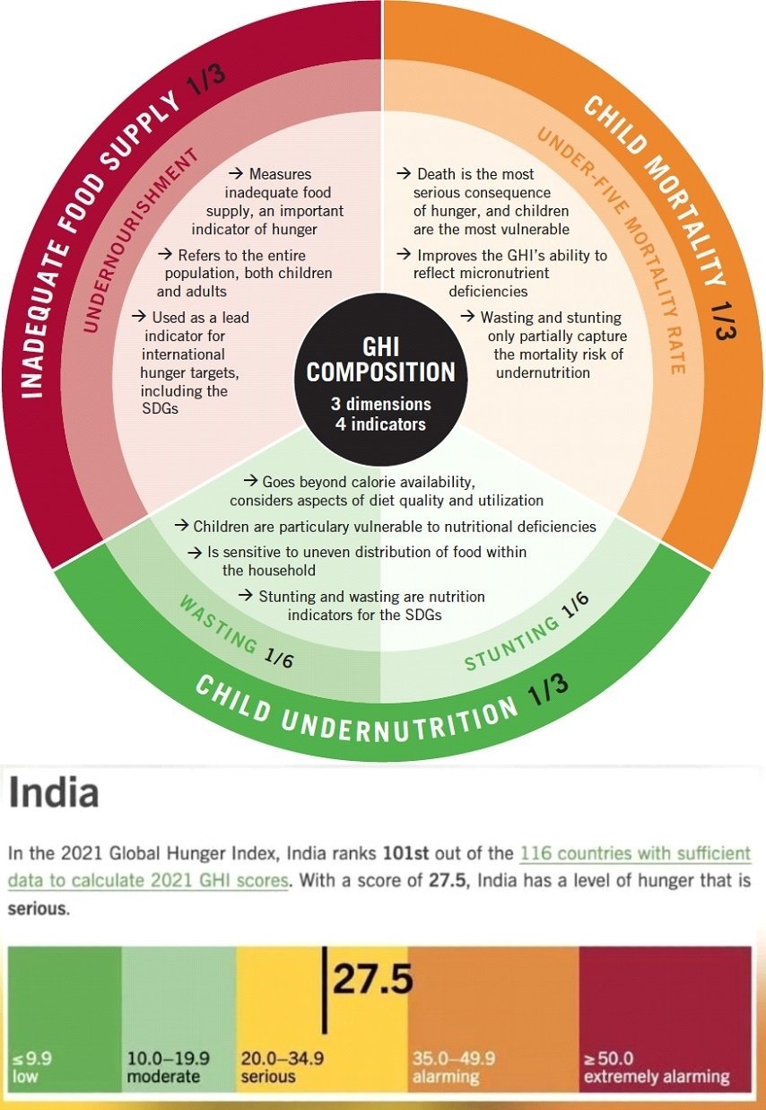 Context: India slipped to 101st position in the Global Hunger Index (GHI) 2021 of 116 countries, from its 2020 position of 94th. It is now behind its neighbours Pakistan, Bangladesh and Nepal. About the GHI Report