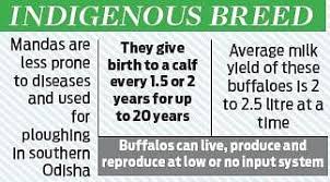 Context: Recently, National Bureau of Animal Genetic Resources (NBAGR) has recognised the Manda buffalo, found in the Eastern Ghats and plateau of Koraput region of Odisha, as the 19th unique breed of buffaloes found in India. About Manda Buffalo
