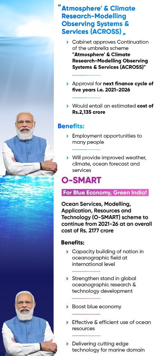 Context: Recently, the Cabinet Committee on Economic Affairs gave its approval for continuation of the Ocean Services Modelling Application Resources and Technology (O-SMART) and Atmosphere & Climate Research-Modelling Observing Systems & Services (ACROSS) schemes from 2021-26. About ACROSS