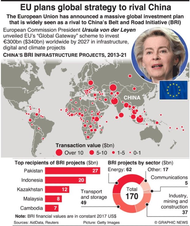 Context: Recently, the European Commission has announced a plan, called Global Gateway, to mobilise EURO 300 billion by 2027 in public and private infrastructure investment around the world.