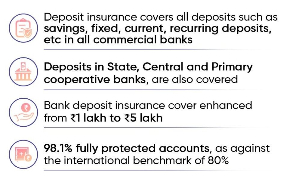 Context: Recently, Central government has highlighted the significance of increase in bank deposit insurance cover, in case of problems occurring such as closure, from Rs 1 lakh to Rs 5 lakh. PM Modi is to address the nation on Bank Deposit Insurance.