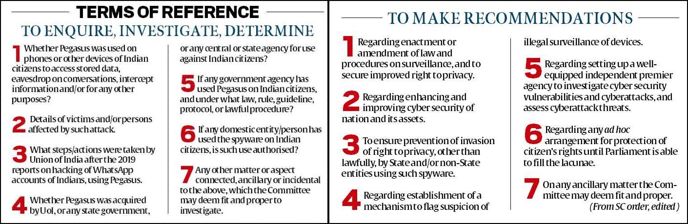 Context: The Supreme Court of India has appointed a committee presided by Justice (Retd.) R V Raveendran to inquire into the Pegasus revelations.