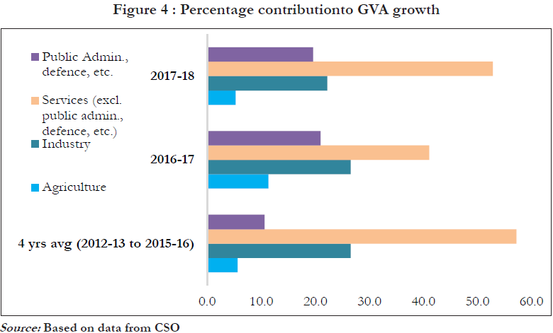 GVA growth of major sectors • The agriculture sector registered significantly higher growth in 2016-17 than the previous two years on the back of normal monsoon. Most of the other crops and noncrop agriculture sector also showed significant growth. • Public administration, defence & other services’ sector also registered growth due to higher payouts in salaries and arrears on account of implementation the Seventh Pay Commission. • However, growth of industry sector declined in the last financial year. The growth of manufacturing sector showed an improvement in 2017-18.