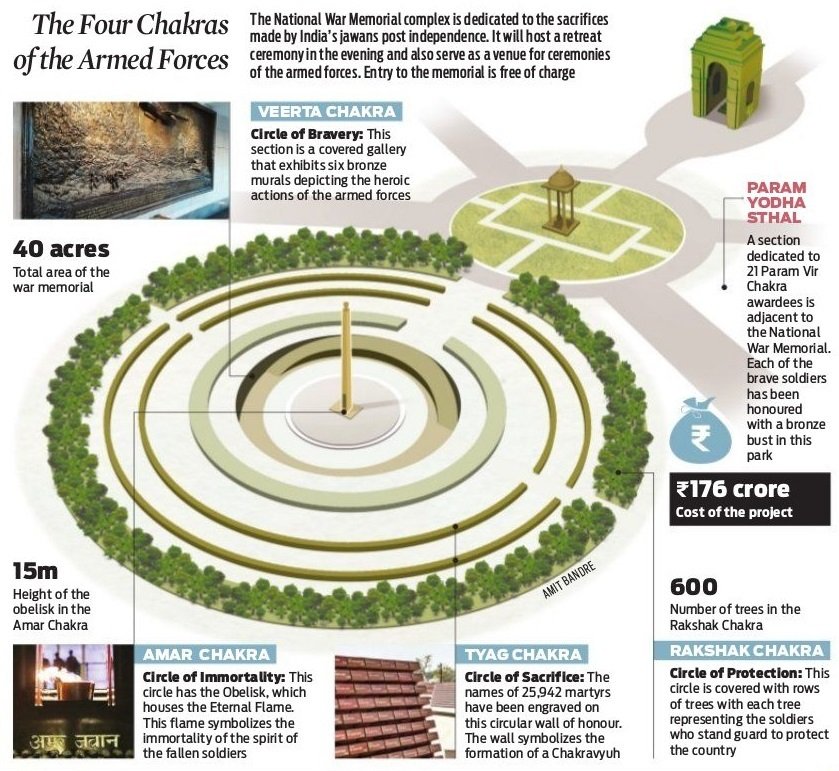 - The architecture of the memorial is based on four concentric circles:Raksha Chakra, Tyag Chakra, Veerta Chakra, and Amar Chakra.