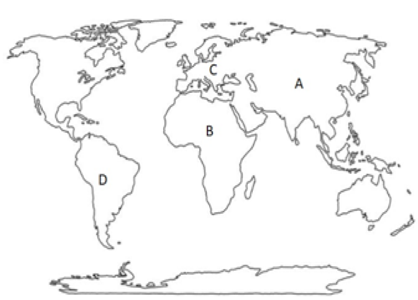 A-Aisa, B-Antarctica, C-Europe, D-South America