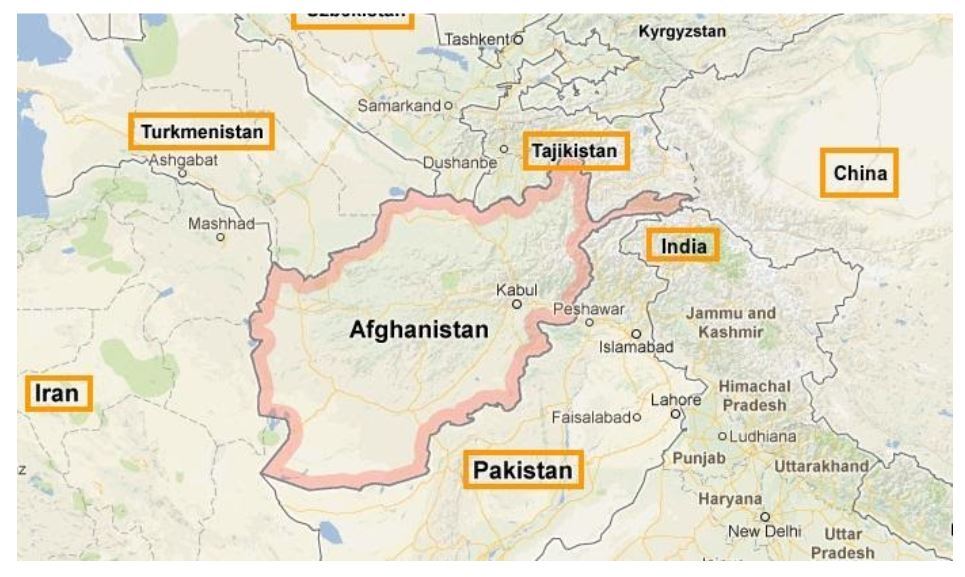 Afghanistan borders Tajikistan, Turkmenistan and Uzbekistan to the north, Iran to the west, Pakistan to the east and south. It has a small border section with China and India to the northeast.