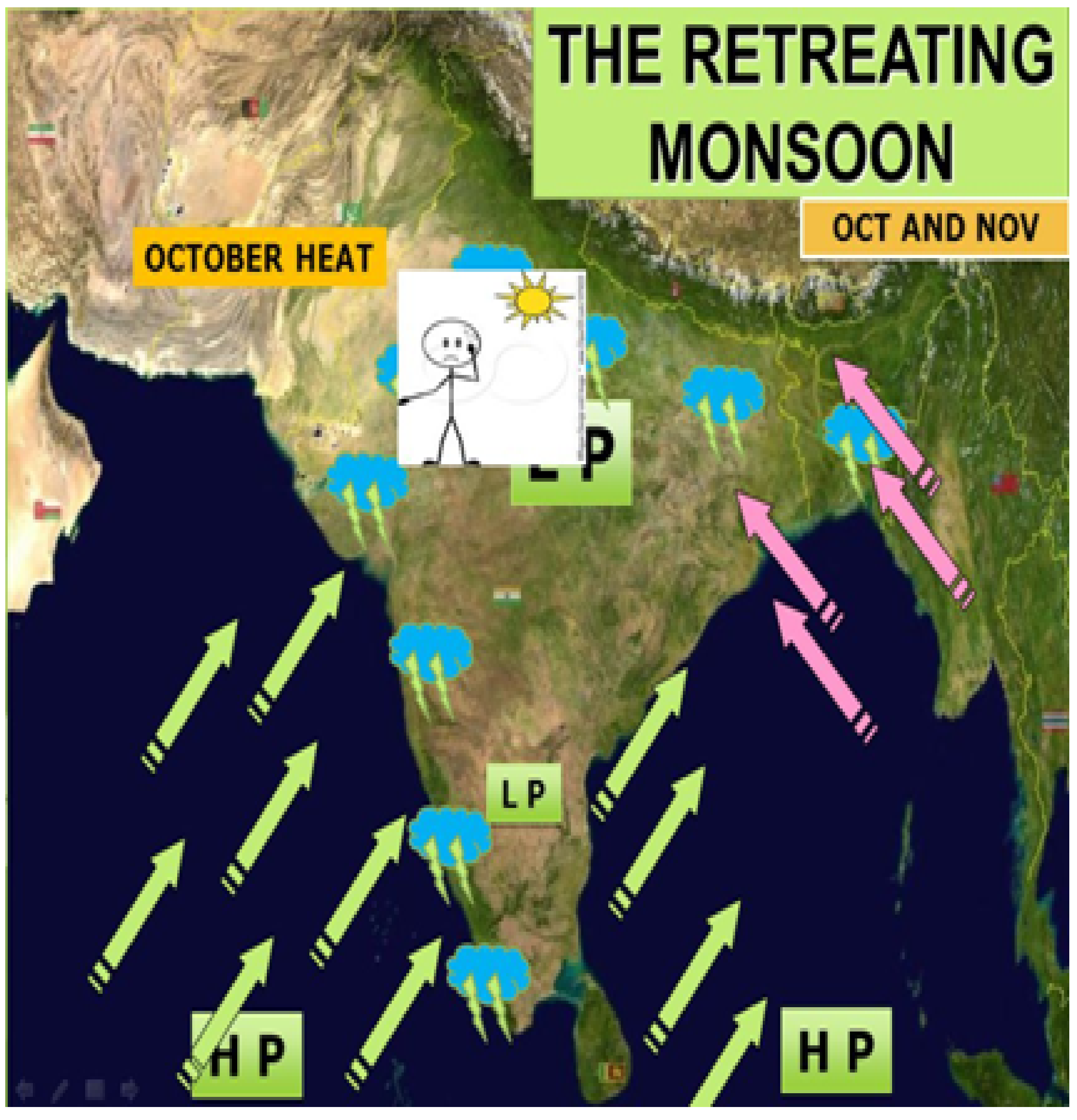 First statement is incorrect because the low pressure is associated with monsoon which occurs in June- July. Third statement is incorrect because western disturbances is mainly occurs in December in northern part of India. • The weather in the month of October in the Indian sub-continent is called 'October heat'. • During October and November, with the apparent movement of the sun towards the south, the monsoon trough or the low-pressure trough over the northern plains becomes weaker. • This is gradually replaced by a high-pressure system. The south-west monsoon winds weaken and start withdrawing gradually. By the beginning of October, the monsoon withdraws from the northern plains. • The months of October and November form the period of transition from the hot rainy season to dry winter conditions. The retreat of the monsoon is marked by clear skies and a rise in temperature. • While day temperatures are high, nights are cool and pleasant. The land is still moist and the weather becomes rather oppressive during the day and is commonly known as October heat.