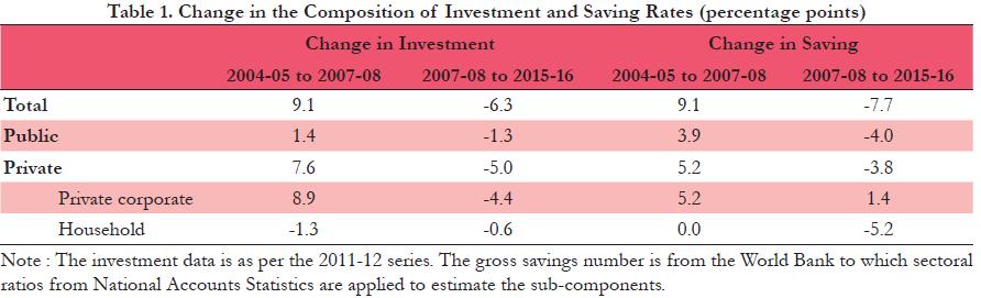 Essentially, private investment and household/government saving (Table 1). Based on the break-up of investment and saving, that is available up to 2015-16, private investment accounts for 5 percentage points out of the 6.3 percentage point overall investment decline over 2007-08 and 2015-16. The fall in saving, by about 8 percentage points over the same period, has been driven almost equally by a fall in household and public saving. The fall in household saving has in turn been driven by a fall in physical saving, partly offset by an increase in the holding of financial assets. Within the latter, there has been a shift from currency and bank deposits towards market instruments, viz. shares and debentures, as discussed in Chapter 1 of Economic Survey 2017-18, Volume 2.
