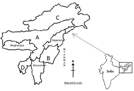 A-Assam, B-Arunachal Pradesh, C-Tripura, D-Manipur