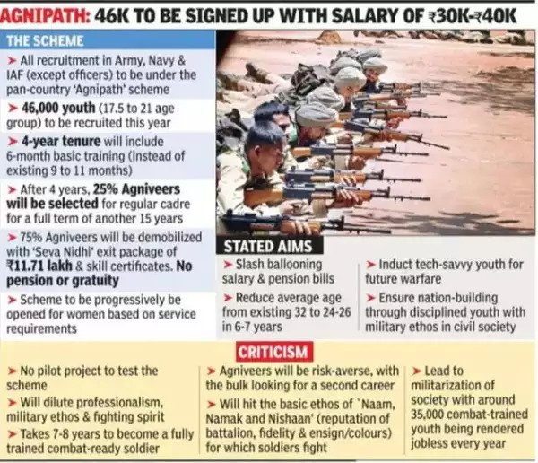 Context: Recently, the Ministry of Defence announced the Agnipath recruitment scheme for the induction of young soldiers into tri-defence services.