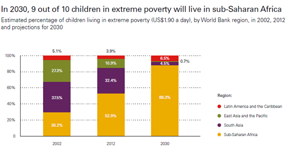 Children living in extreme poverty The measure most commonly used to calculate monetary poverty is the international poverty line developed by the World Bank and set at US $1.90 per day since October 2015. By this measure, in 2012, almost 900 million people struggling to survive below that line, were living in extreme poverty. Because poorer families tend to be larger, children are disproportionately represented among the extreme poor. While children aged 17 and under account for about one third (34 per cent) of the total population in low- and middle-income countries, they make up nearly half (46 per cent) of the population living on less than US $1.90 per day Nevertheless, the last three decades have seen unprecedented progress in reducing extreme poverty. The overall proportion of people living in extreme poverty has fallen, and that trend is projected to continue. In 2012, the number of people living in extreme poverty worldwide was almost half of what it had been at the end of the 1990s. But particular attention to the pace of progress is warranted in some regions. In the Middle East and North Africa, for example, after years of progress, the rates of monetary poverty appear to be stagnant or, by some estimates, even on the rise This concentration is especially alarming given that sub-Saharan Africa is the world’s youngest region, with children under age 18 accounting for around half the population. Over the next 15 years, the region will account for almost the entire increase in the world’s population of children. If current trends persist, 156 million children in sub-Saharan Africa will be struggling to survive on less than US $1.90 a day in 2030; as a group, they will comprise nearly half of the world’s extreme poor. Poverty is not just more pervasive but also more intense in sub-Saharan Africa than in other regions. On average, poor people there are starting the journey towards the US $1.90 extreme poverty threshold from a lower base than their counterparts in other parts of the world. Some 89 million people in the region, or around 10 per cent of the population, lived on less than 80 cents a day in 2012. In sub-Saharan Africa, people who are below the extreme poverty threshold live on an average of US $1.20 a day, compared to US$1.50 for the extreme poor in South Asia.230
