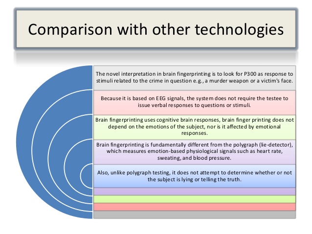 Applications: Brain fingerprinting has two primary applications. First, it is used in detecting whether information about a specific crime, terrorist act, or incident is stored in the brain. Brain fingerprinting can be viewed as a modern, and more accurate, lie detection test. The guilty, since he has committed the crime, has the details of the crime in his memory. However, the innocent does not have the details in his memory. Brain fingerprinting is a test of whether the details are present in the memory or not. If they are, then the person is guilty, otherwise innocent. Second, it is used to determine whether a subject has a specific type of knowledge, expertise, or training, such as information specific to FBI agents, ISIL-trained terrorists, or bomb-makers.