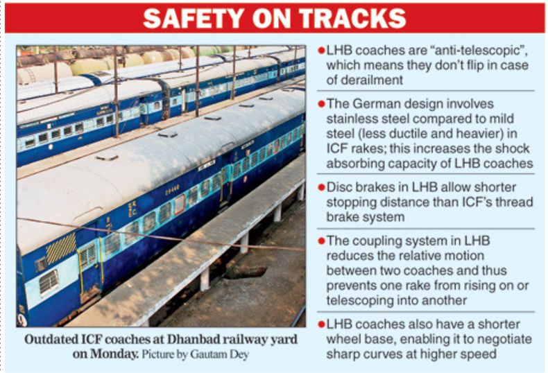 Issues (from this particular incident): A large number of railway accidents in India are ascribed to derailment: Tracks are often old and overused and experts have made an urgent case for an overhaul. It is possible that the toll would not have been this high if the outdated heavy bogies had been replaced by the lighter LHB coaches. . By all accounts, the authorities know why rail accidents take place and what needs to be done, which is evident from the statements of the spokesperson of MoRailways who are assuring to raise the production of LHB coaches. But that wisdom is not acted upon.