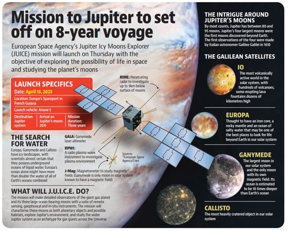 Context: Recently, the European Space Agency (ESA) has launched the Jupiter Icy Moons Explorer (Juice) mission from its spaceport in French Guiana on an Ariane 5 launcher.