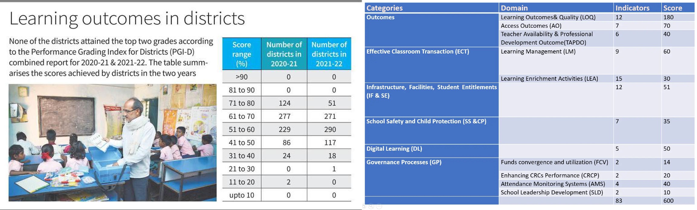 Context: Recently, the Ministry of Education (MoE) has released the Performance Grading Index for Districts (PGI-D) as a combined report for 2020-21 and 2021-22 which assesses the performance of school education system at the district level.