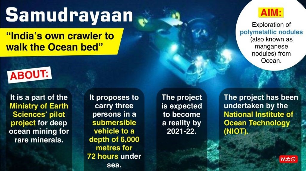 Context: After the success of Chandrayaan Mission, India is set to launch the Samudrayaan Mission to explore depths of the deep ocean and its resources. This will be India’s first manned mission to explore the mystery of the ocean.