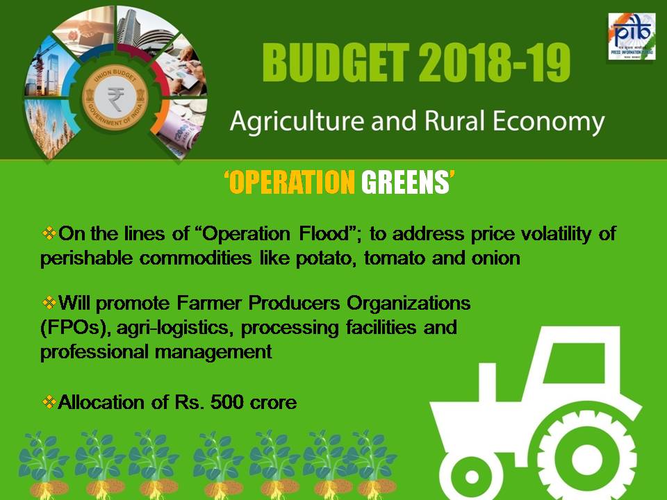 Operation Greens was announced in the Budget speech of 2018-19 with an outlay of Rs 500 crores to stabilize the supply of Tomato, Onion and Potato(TOP) crops and to ensure availability of TOP crops throughout the country round the year without price volatility.