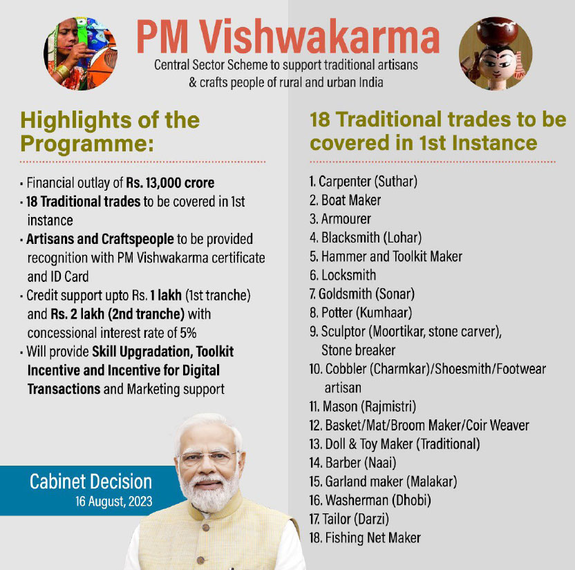 Empowering Traditional Artisans: The Vishwakarma Scheme is significant as it aims to empower and uplift traditional artisans and craftsmen engaged in various trades. It recognizes their importance in India’s cultural and economic fabric.
