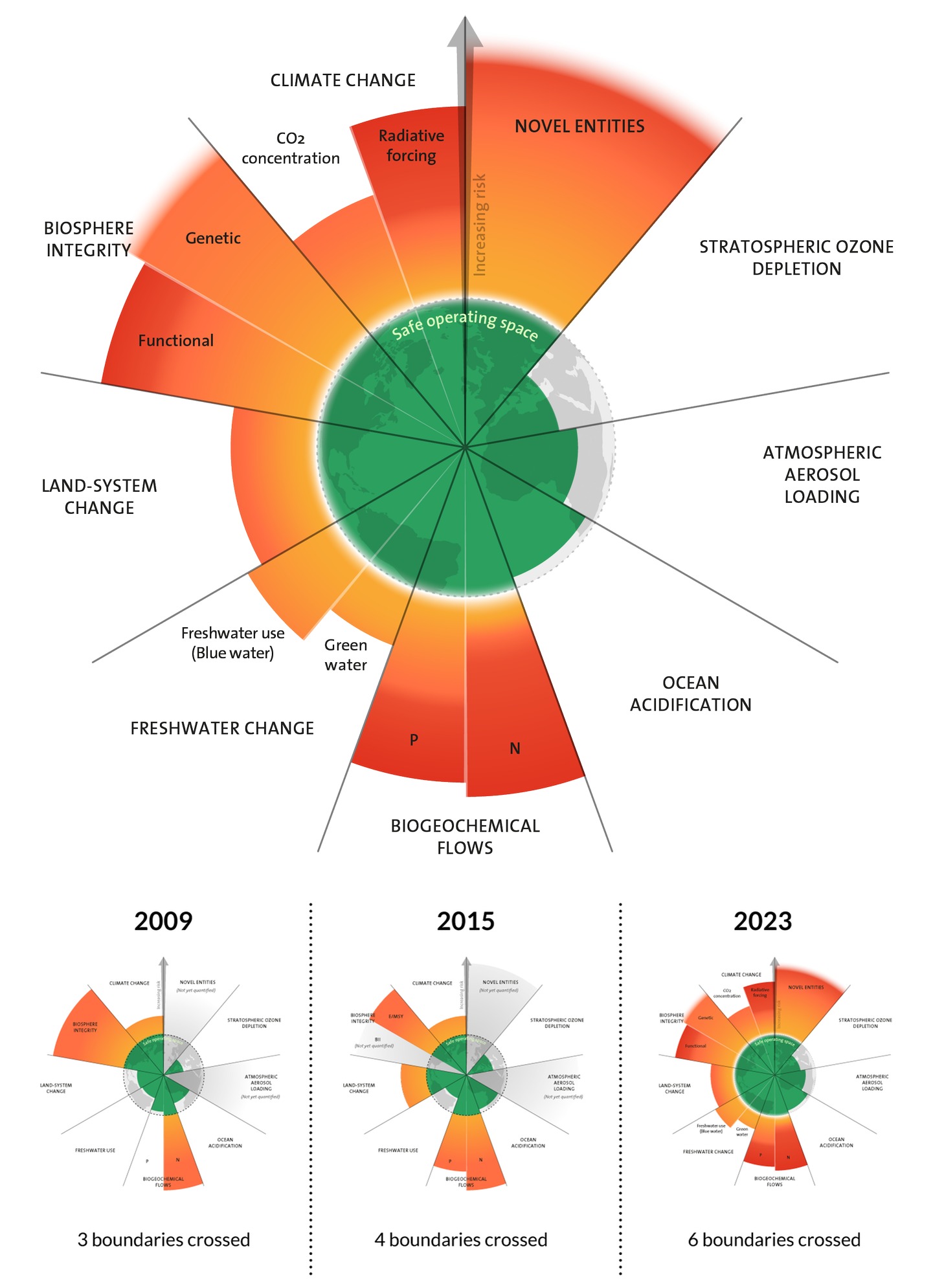 6 boundaries are now transgressed and pressure is increasing on all boundary processes except ozone depletion. The 6 boundaries that are transgressed are: