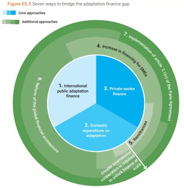 The adaptation finance gap is the difference between the estimated costs of adapting to climate change in developing countries and the amount of finance available to meet these costs.