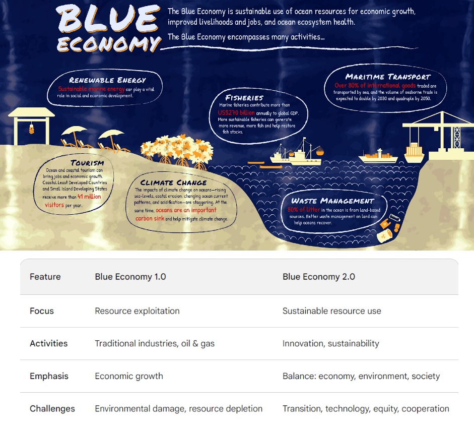 Definition: The blue economy encompasses economic activities related to oceans, seas, and coastal regions, with a strong emphasis on sustainability.