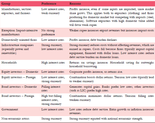 Policy decisions affect various groups differently. As noted by the economic survey 2017-18, the table below lists below the preferences of different groups in relation to interest and exchange rates, as well as the underlying reasons. For example, strong exchange rates may be preferred by companies that sell non-tradeables and rely on imports for their inputs: the classic case here is power companies that sell electricity to domestic distribution companies and import their capital equipment. Conversely, services exporters such as IT companies will be keen on competitive exchange rates because they sell mainly abroad, while importing very little. A strong exchange rate is preferred by those who equate currency strength with broader national strength.