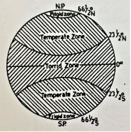 • Torrid or tropical zone: This zone lies between the Tropic of Cancer and the Tropic of Capricorn. The apparent movement of the sun during a year is between these two latitudes. The sun's rays here are almost vertical and it receives maximum insolation. • Temperate zones: This zone lies between the torrid zone and the Frigid zone. It shares features of both the surrounding zones. Sun is never directly overhead, thus it possess moderate temperature. • Frigid zones: Here the sun rays fall at low angles because the sun does not rise much above the horizon. Thus, these zones are the coldest regions of Earth.
