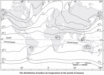 The temperature distribution on Earth is represented with the help of isotherms, which are the lines joining places having equal temperatures. They generally lie parallel to the latitude due to the pronounced effect of the latitude on temperature of an area. However, they take sudden bends where land-water contrasts are maximum. Thus, there are deviations in the isotherms in northern and southern hemispheres.