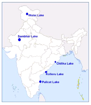 Kolleru Lake is one of the largest freshwater lakes in India located in state of Andhra Pradesh. With the onset of 2017 summer, a major portion of the Kolleru Lake dried up. Chilika Lake - Odisha - Nalaban Bird Sanctuary. Pulicat Lake is the second largest brackish water lake or lagoon in India, after Chilika Lake. It straddles the border of Andhra Pradesh and Tamil Nadu states with over 40% of it in Andhra Pradesh and 60% in Tamil Nadu situated on the Coromandal Coast in South India. The lake encompasses the Pulicat Lake Bird Sanctuary. The barrier island of Sriharikota separates the lake from the Bay of Bengal and is home to the Satish Dhawan Space Centre.