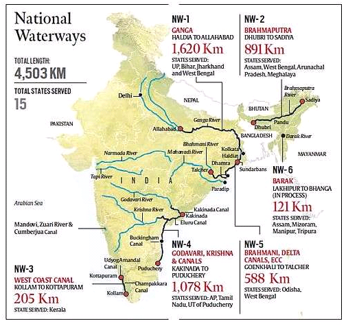 National Waterway-1 from Allahabad to Haldia was in news due to threat for Gangetic river dolphins from its construction. National Waterway-2 is from Dibru and Sadiya and National Waterway-3 is from Kollam to Kottappuram in Kerala.