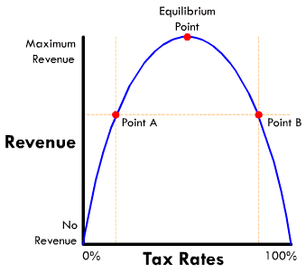 Laffer Curve is a representation of the relationship between tax rates and tax revenue collected by governments. It illustrates the concept of taxable income elasticity. It is a bell shaped curve and one of the uses of the Laffer Curve is to allow for optimal taxation. The Laffer curve is typically represented as a graph which starts at 0% tax with zero revenue, rises to a maximum rate of revenue at an intermediate rate of taxation, and then falls again to zero revenue at a 100% tax rate.