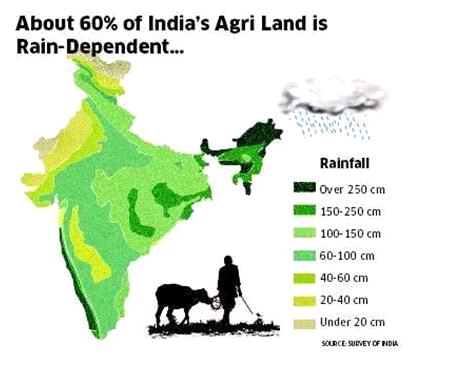 Most of India's (coarse) cereals (91%), pulses (91%), oilseeds (80%) and cotton (65%) are produced in rainfed areas. Small areas of almost all rainfed crops are scattered in most of the districts, except for a few crops such as soybeans and linseed that have specific agro-climatic requirements.