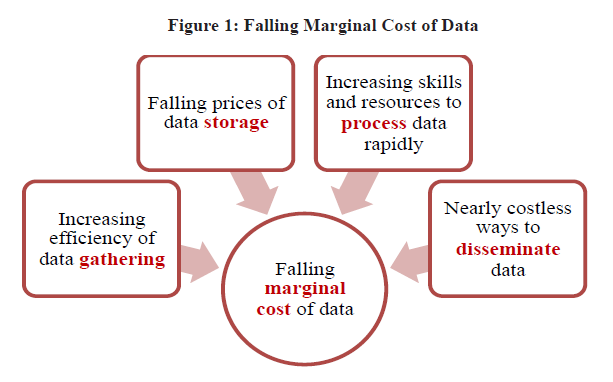 Data is accumulated through digital footprints left by online activities with near-Zero cost. Marginal costs associated with Data can be seen as per the following;?