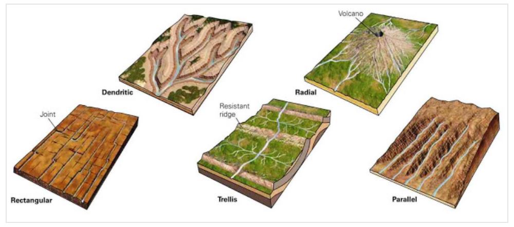 1. A drainage pattern which looks like tree branches with lots of twigs is known as Dendritic drainage pattern. For example, the rivers of northern great plains.