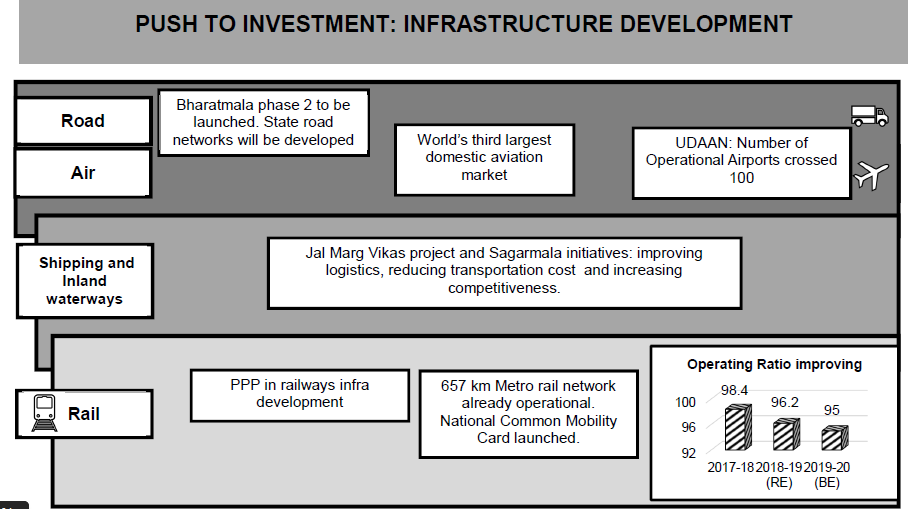 Connectivity is the lifeblood of an economy. To take connectivity infrastructure to the next level, we will build on the successful model in ensuring power connectivity – One Nation, One Grid – that has ensured power availability to states at affordable rates. Govt. will make available a blueprint this year for developing gas grids, water grids, i-ways, and regional airports. The Government has given a massive push to all forms of physical connectivity through Pradhan Mantri Gram Sadak Yojana, industrial corridors, dedicated freight corridors, Bhartamala and Sagarmala projects, Jal Marg Vikas and UDAN Schemes.