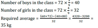 Average weight of a class is 60kg and average weight of boys in the class is 80kg. Ratio of boys to girls in the class is 5 : 4. If there are 72 students in the class, then find the average weight of girls in the class.